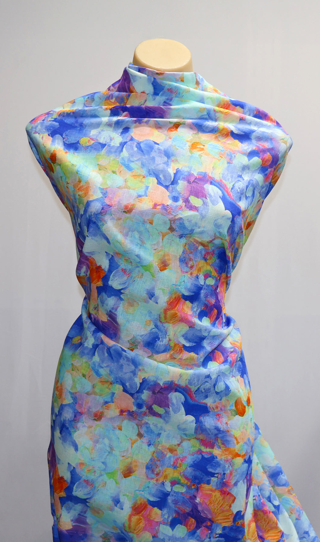 Width: 140cmComposition: 55% Cotton, 45% Linen GSM: 105 GSMColour: Blue /Multi Uses: Slip dresses, Summer dresses, Kaftans, skirts & jumpsuits